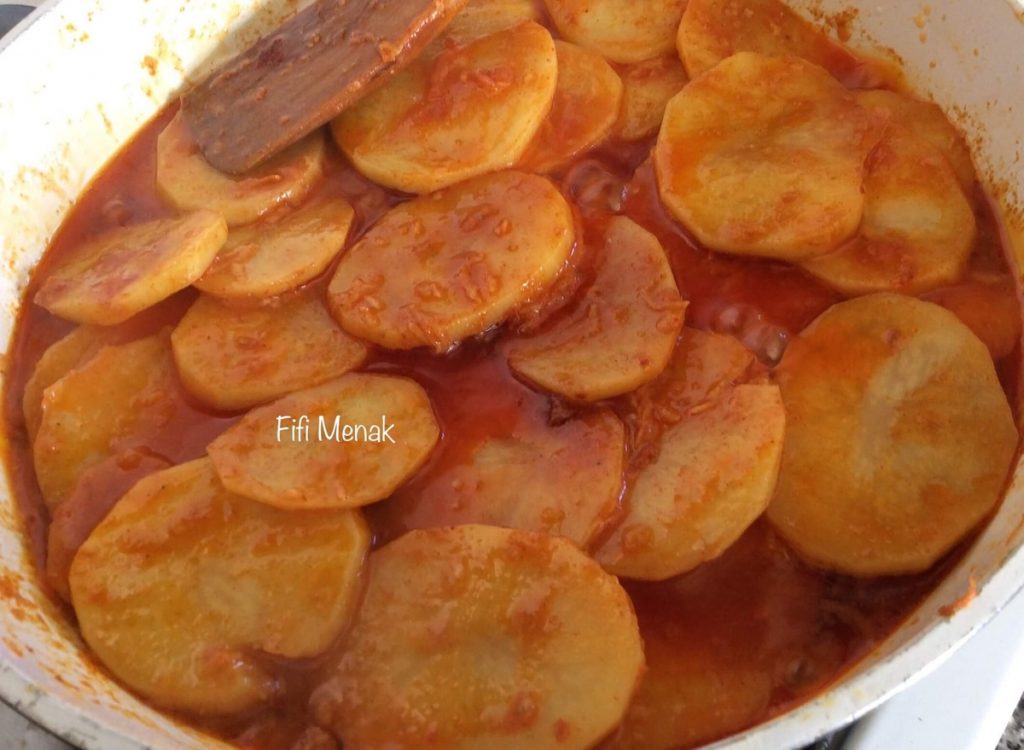 Ajouter l’huile, la pomme de terre coupée finement, la purée de poivrons rouges ou le poivre rouge en poudre.